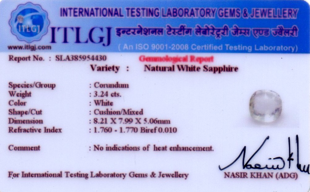 Weight(ct.) : 3.24 Weight(grm.): 0.64 Ratti in Stone: 3.56 Ratti in Gold : 5.33 Shape: Cushion/Mixed Measurement(in mm): IN REPORT CARD Refraction Index:
